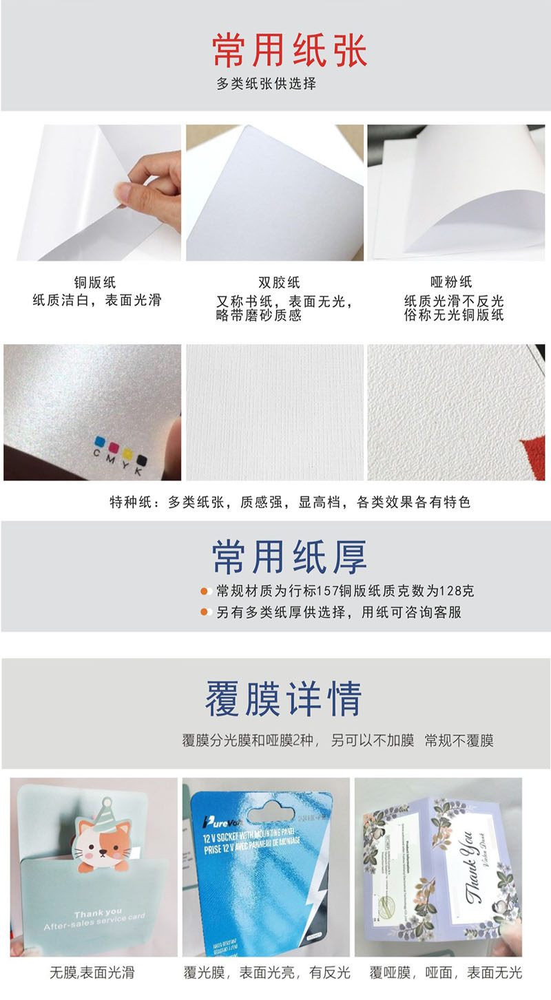 印刷紙張:銅版紙、雙膠紙、啞粉紙、珠光紙、其他藝術(shù)紙(藝術(shù)紙種類較多我們可以免費(fèi)提供紙樣供您選擇)